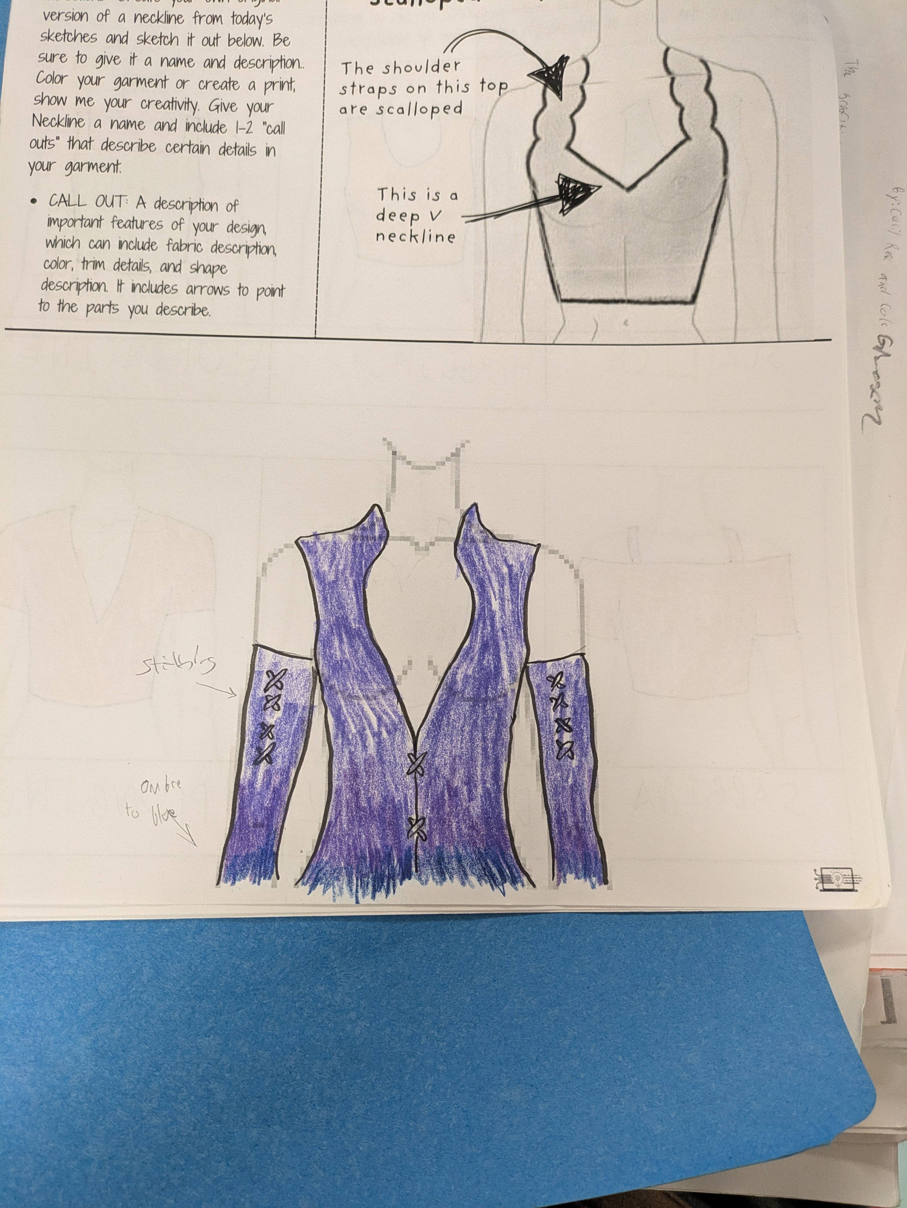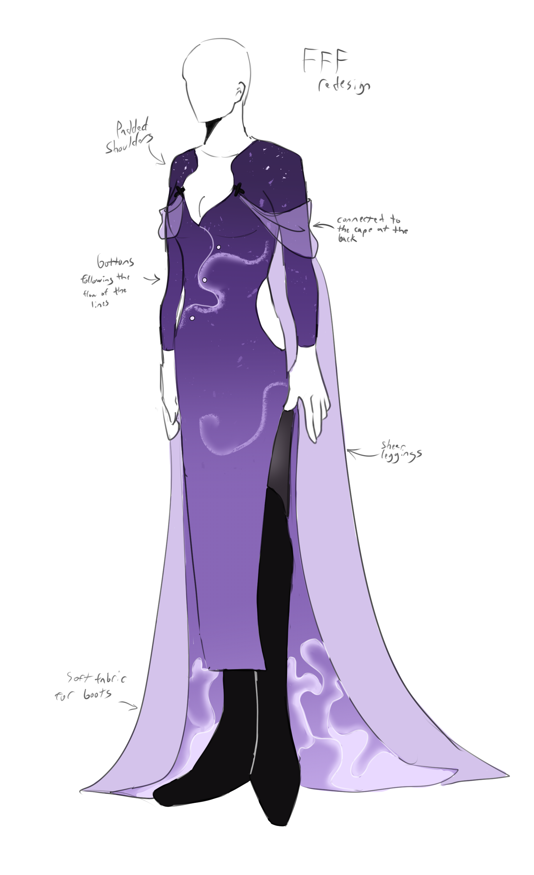 My remake here is that I completed the design, and I also reimagined it. The base of the redesign is keeping the general theme I had and going to town with it. The first iteration very much looked like something in a fantasy wardobe, so I leaned into that and went for something that looked like what a space goddess would wear. I kept the shape of the X'es present in the original by using them to hold the shoulder cape bits onto the front of the dress.